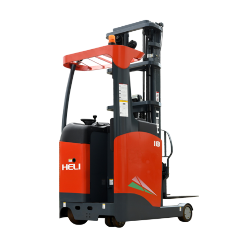 Reach Truck are forklifts used in narrow aisle applications, such as warehouses. They are designed to have two outer legs that help distribute the load, and a single set of wheels in the back. The wheels are located below the operator, which help create a tighter turn radius. This allows operators to navigate smaller spaces, and still be able to reach higher racking.